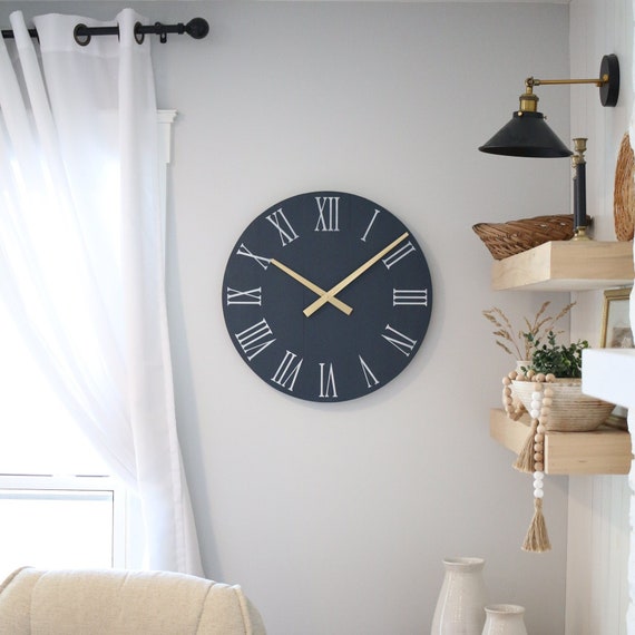 Large Wall Clock Navy Gold Living Room Decor Mid Etsy Uk